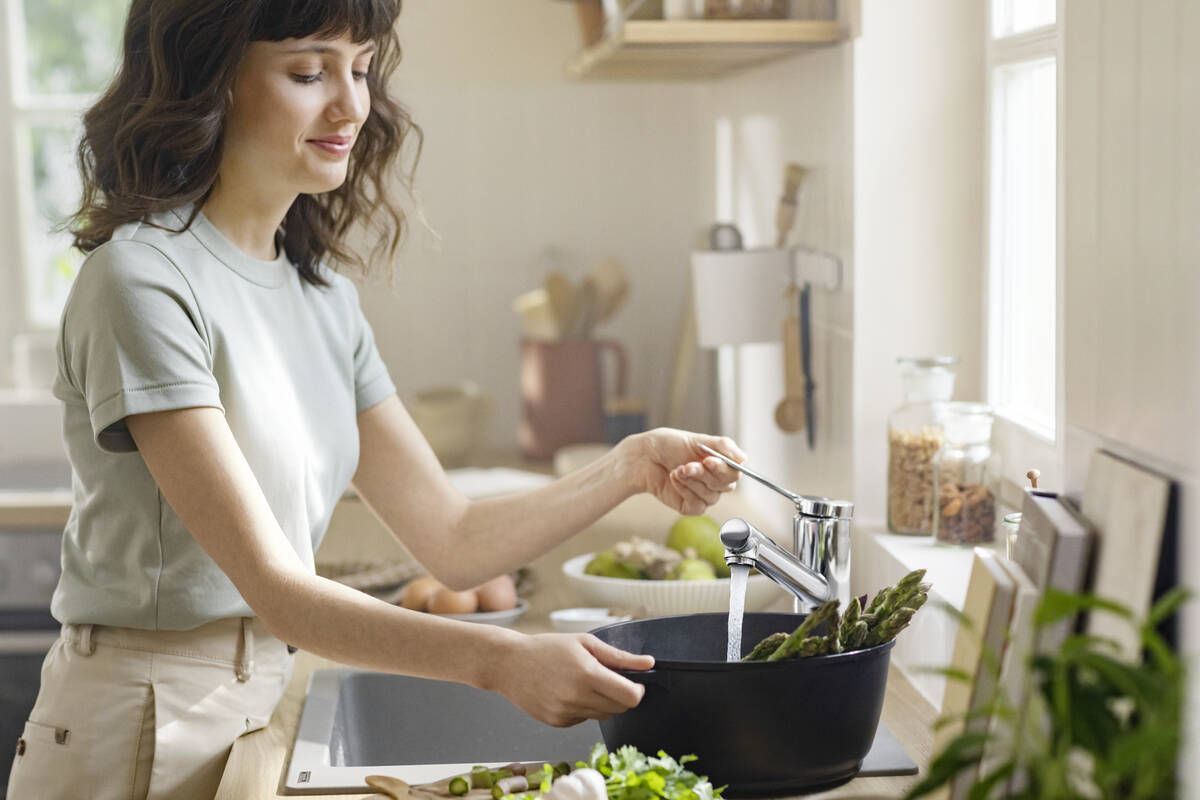 Mit einer hohen Durchflussleistung von bis zu 11,6 l/min (3 bar) sind auch große Töpfe schnell befüllt. Dabei wird das Wasser mit Luft angereichert und spritzt weniger (AirPower). Außerdem fühlt es sich samtweich an und reinigt auch empfindliche Lebensmittel genauso schonend wie gründlich.