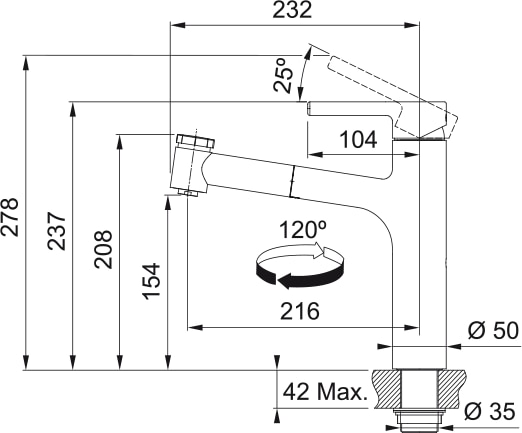 - Komfortable Umschaltfunktion der Zugauslaufvariante am Brausekopf von Normalstrahl auf Brausestrahl