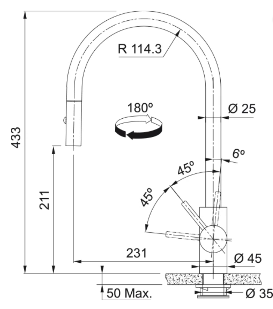 Komfortable Umschaltfunktion der Zugauslaufvariante am Brausekopf von Normalstrahl auf Brausestrahl 0 - 90° Bediengriff Ausführung: massiv Edelstahl Hochdruck Planungshinweise: Umstellung auf Brause möglich Auslaufmenge Normalstrahl: 9,3 l min. ( 3 Bar) Laufleiser, schwarzer Gewebeschlauch  Flexible Anschlussschläuche mit 450 mm Länge und 3 / 8 Mutter Hebelstellung 0 - 90° Höhe gesamt: 433 mm Höhe Auslauf: 211 mm Abstand Auslauf: 231 mm Schwenkbereich: 180° DVGW zertifiziert