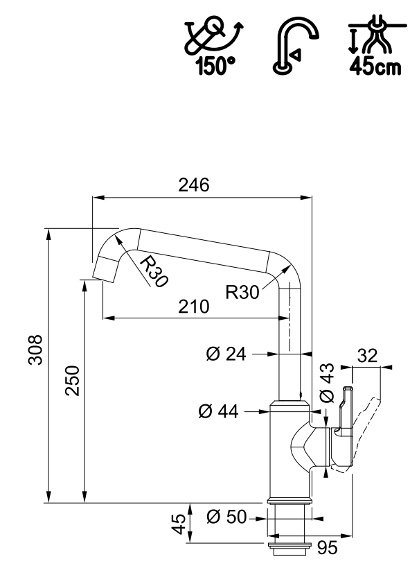 - Armatur URBAN Festauslauf, U-Form, Seitenbedienung, Hochdruck