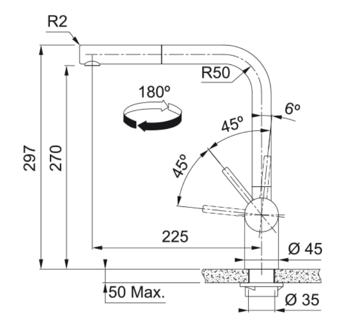 - Auslaufmenge Normalstrahl: 9,7 l min. (3 Bar)
