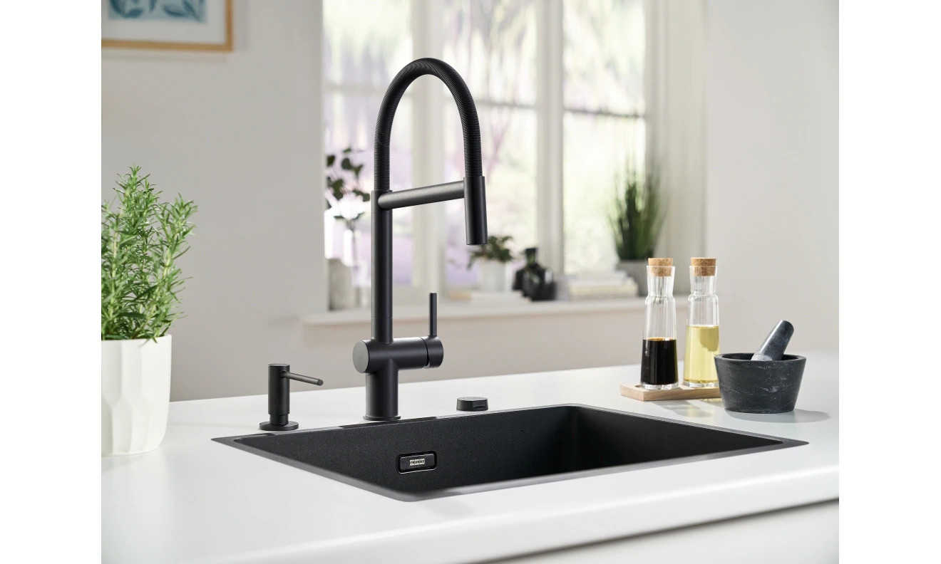 - Hoch positionierter Auslauf, geeignet zum schnellen Befüllen auch von hohen Töpfen oder Gefäßen