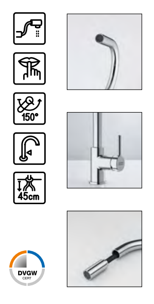 Hoher Auslauf zum Befüllen von hohen Töpfen Verfügbar in fünf trendigen Farben Großer Nutzungsradius durch Auszugsfunktion