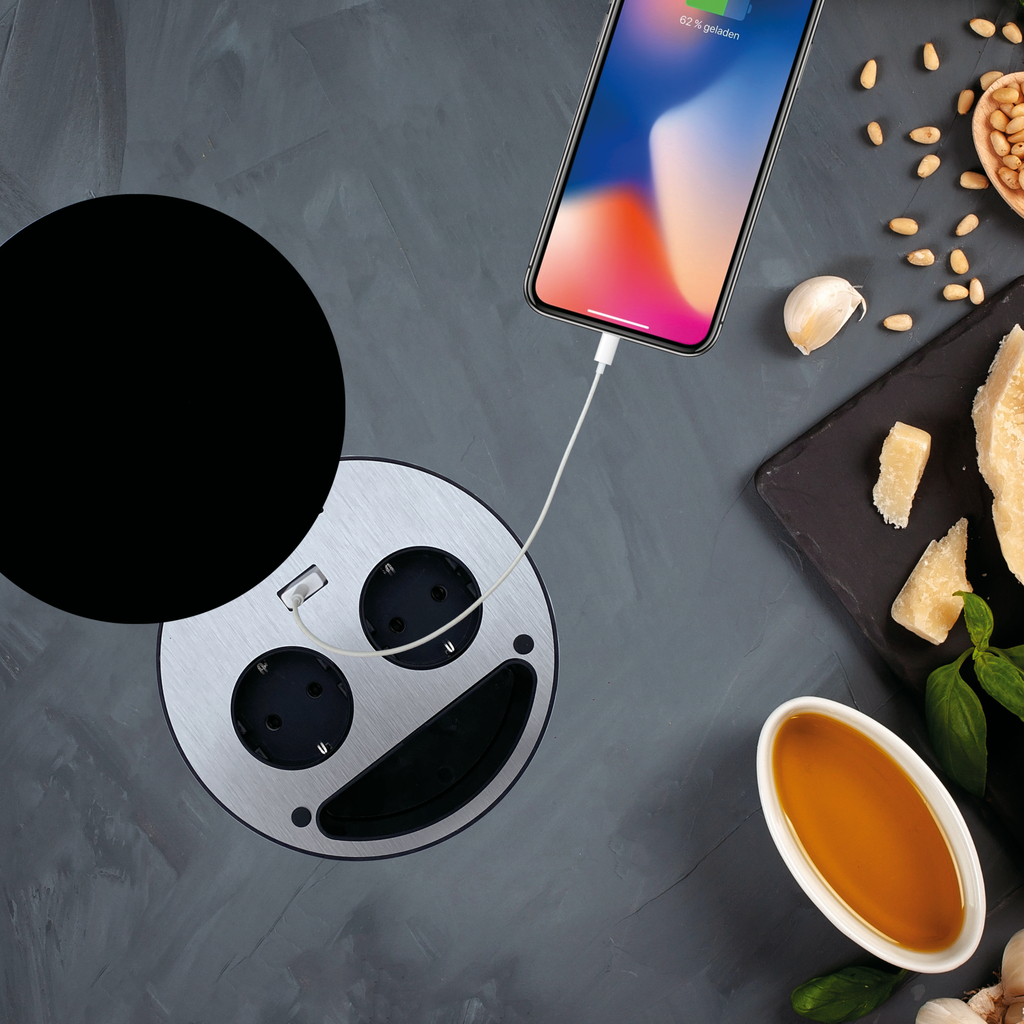 Die Smile Doppelsteckdose ist für die Arbeitsplatte und für die Rückwand geeignet. Die schwenkbare ESG-Glasabdeckung (wahlweise in weiß oder schwarz) ist hitzebeständig und kann z.B. im geschlossenen Zustand als Abstellfläche von heißen Töpfen genutzt werden. Da die Einbautiefe nur ca. 40 mm beträgt, ist ein Einbau über Schubladen problemlos möglich. Bitte Einbauanweisung beachten!