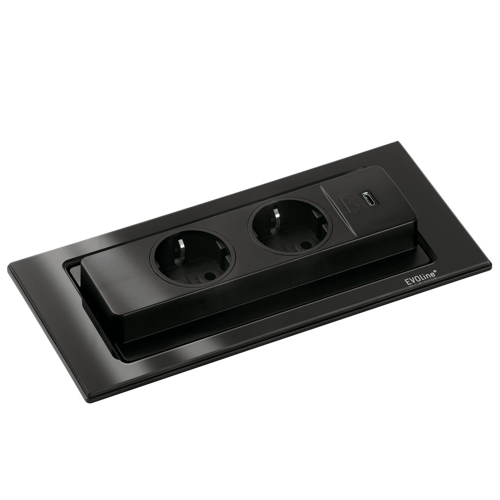 Geschlossen ist Evoline® BackFlip nur eine dünne Platte auf der Arbeitsfläche. Mit einem Finger angetippt dreht er sich um 180 Grad und zeigt seine nützliche Seite: USB-Charger und Steckdose liegen so hoch über der Platte, dass sie vor Wasser geschützt sind. Die Einbautiefe beträgt dennoch nur 53 mm, so dass auch eine Montage über Schubladen oder Geräten möglich ist. Mit neuen Oberflächen ausgestattet, ist der Evoline® BackFlip in schwarz Glas, schwarz lackiert und Edelstahl erhältlich.