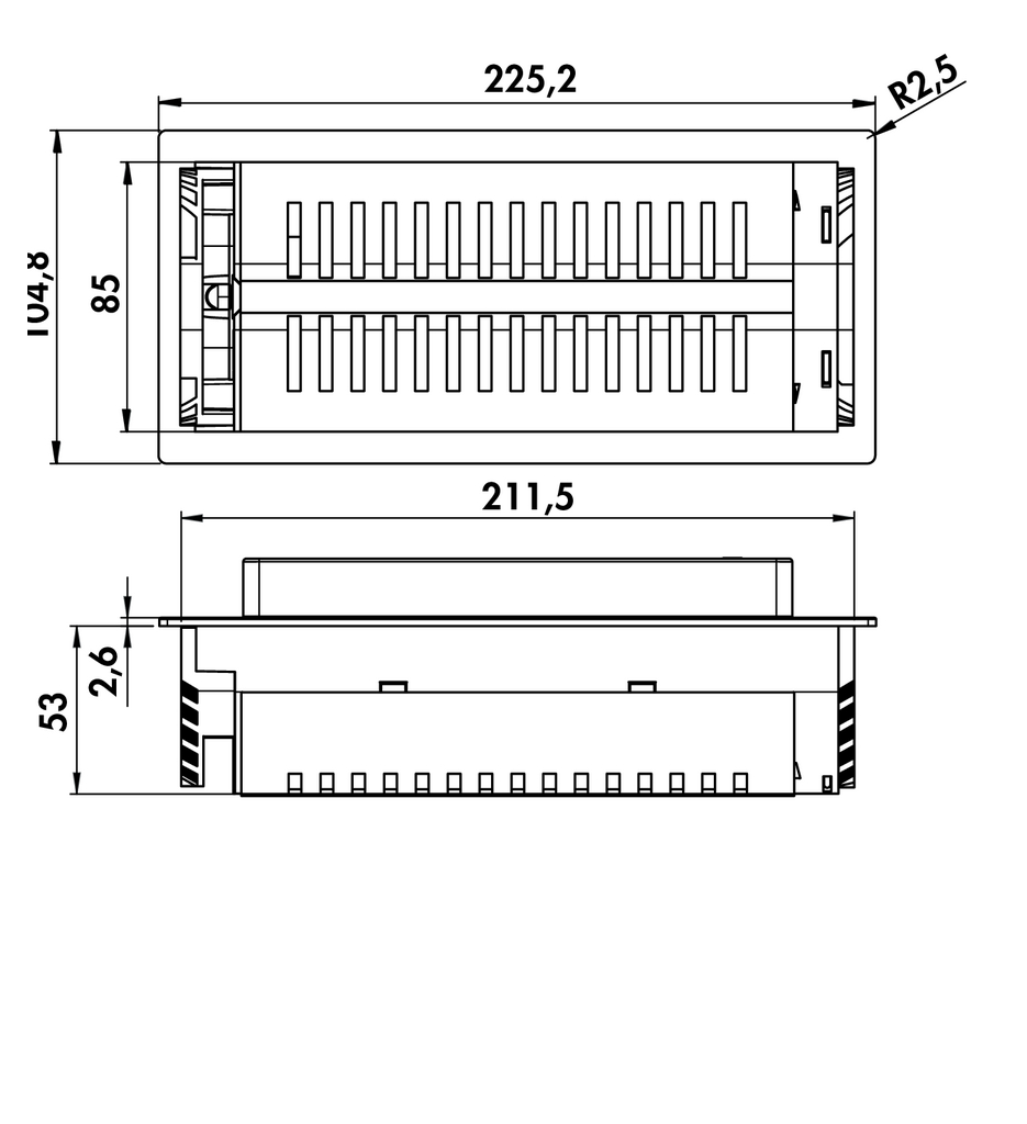 Einbautiefe 53 mm, somit Montage über Schubladen möglich