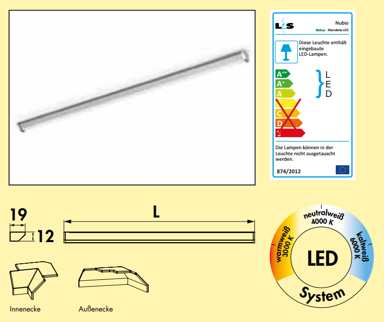 Einzelleuchte 7,8 Watt pro Meter, 12 V stufenlose Regelung der Lichtfarbe von 2700 K warmweiß bis 6500 K kaltweiß max. 80 Lumen/Watt bei 6500 K kaltweiß Leuchtenlänge 2700 mm 2000 mm beidseitige Zuleitung LED Band 2700 mm, beidseitige Einspeisung