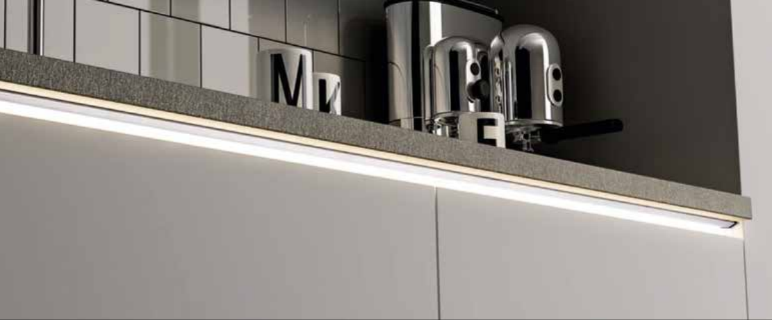 Griffleistenbeleuchtung. Kunststoffgehäuse, edelstahlfarbig, selbstklebendes LED-Band, alle 50 mm kürzbar, keine sichtbaren LED inkl. Halteklammern für Griffleisten. Einzelleuchte edelstahlfarbig, L 1500 mm 7,8 Watt pro Meter, 12 V stufenlose Regelung der Lichtfarbe von 2700 K warmweiß bis 6500 K kaltweiß max. 80 Lumen/Watt bei 6500 K kaltweiß 2000 mm beidseitige Zuleitung LED Band, beidseitige Einspeisung inkl. 4 Endkappen LIC LED-System kompatibel