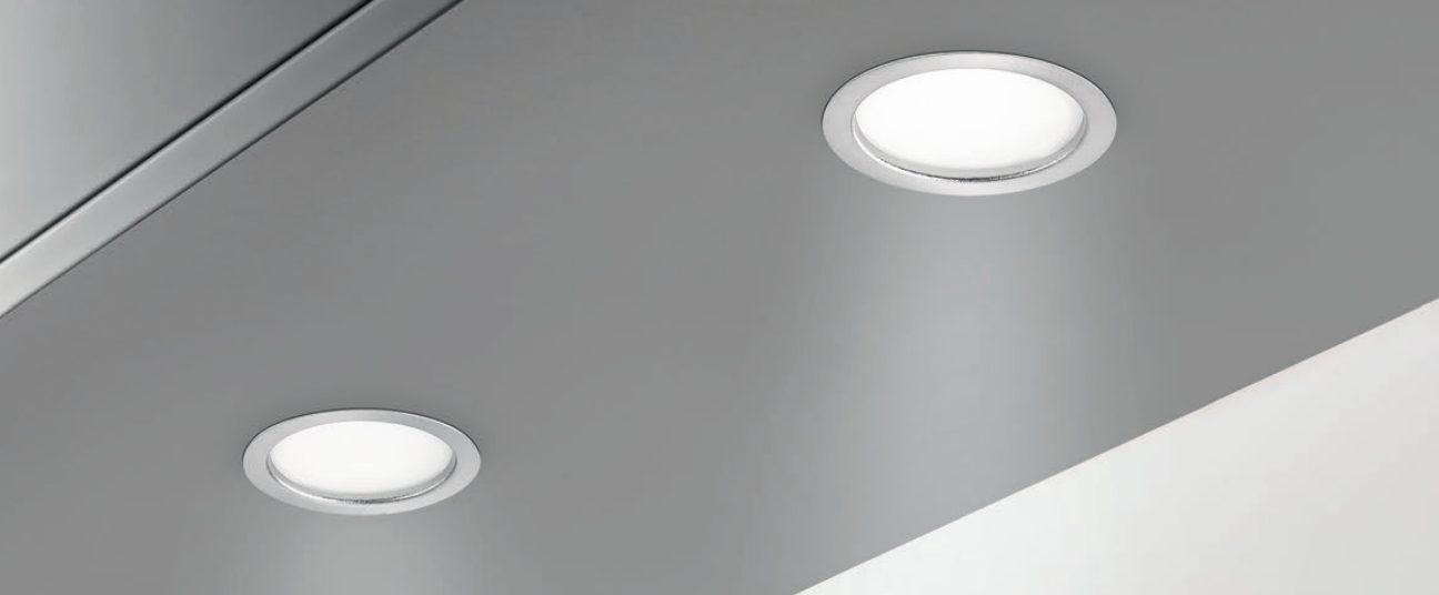 Einbauleuchte. Metallgehäuse, edelstahlfarbig, Ausleuchtung ohne sichtbare LED-Punkte.