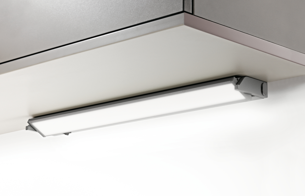 Unterbodenleuchte. Um 150° schwenkbare LED Leuchteneinheit mit Acrylvorsatz, silberfarbig, Ausleuchtung ohne sichtbare LED-Punkte.
