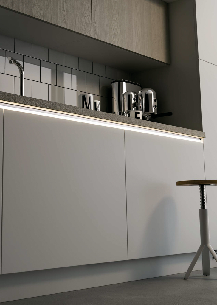 Griffleistenbeleuchtung. Kunststoffgehäuse, edelstahlfarbig, selbstklebendes LED-Band, alle 50 mm kürzbar, keine sichtbaren LED inkl. Halteklammern für Griffleisten.