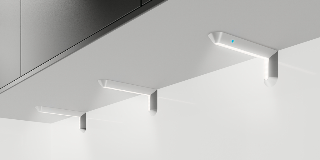 Unterbodenleuchte in abgewinkelter L-Form. Aluminiumdruckgehäuse, Ausleuchtung ohne sichtbare LED-Punkte.