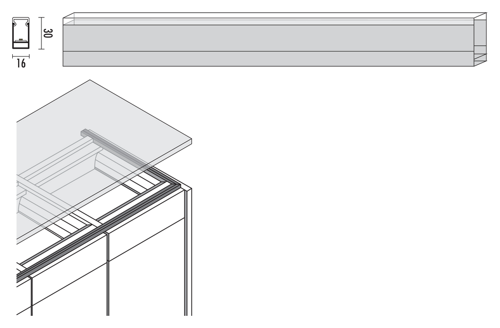 Die Arbeitsplatte muss bauseits mit 16 mm Holzleisten aufgefüttert werden.