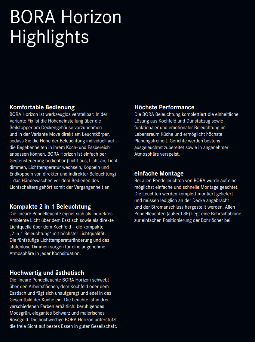 Die lineare Pendelleuchte BORA Horizon eignet sich als indirektes Ambiente Licht über dem Esstisch genauso wie als direkte Lichtquelle über dem Kochfeld - die kompakte "2 in 1 Beleuchtung" mit höchster Lichtqualität. Die fünfstufige Farbtemperaturänderung sowie das stufenlose Dimmen sorgen für eine angenehme Atmosphäre in jeder Kochsituation. BORA Horizon ist einfach per Gestensteuerung bedienbar (Licht aus, Licht an, Licht dimmen, Farbtemperatur wechseln) - das Händewaschen vor dem Bedienen des Lichtschalters gehört somit der Vergangenheit an.