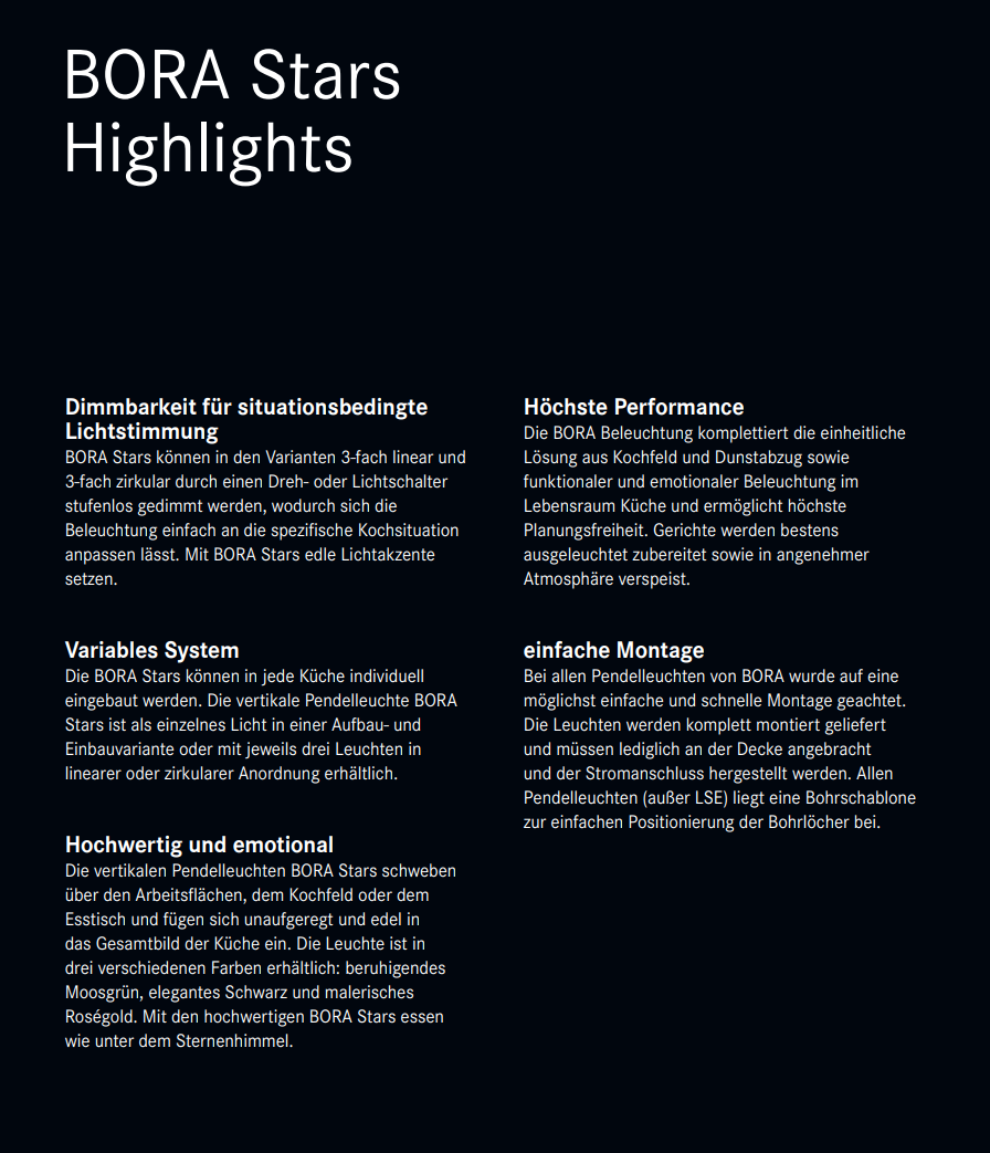 BORA Stars können in den Varianten 3-fach linear und 3-fach zirkular durch einen Dreh- oder Lichtschalter stufenlos gedimmt werden, wodurch sich die Beleuchtung einfach an die spezifische Kochsituation anpassen lässt. Mit BORA Stars edle Lichtakzente setzen.