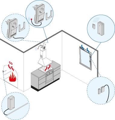 - Der Funk- Temperatursensor ist integrierbar in das Funksystem des Fensterkontaktschalters. Dabei wird über die Temperatur der Betriebszustand des Kamins überwacht. Nur bei brennendem Kamin muss eine Fensteröffnung erfolgen, während die Dunstabzugshaube aktiv ist. Somit entfällt die strickte Kopplung von aktiver Dunstabzugshaube und geöffnetem Fenster. Der Temperatursensor ist geeignet für den Einbau in geschlossenen und trockenen Wohnräumen.
