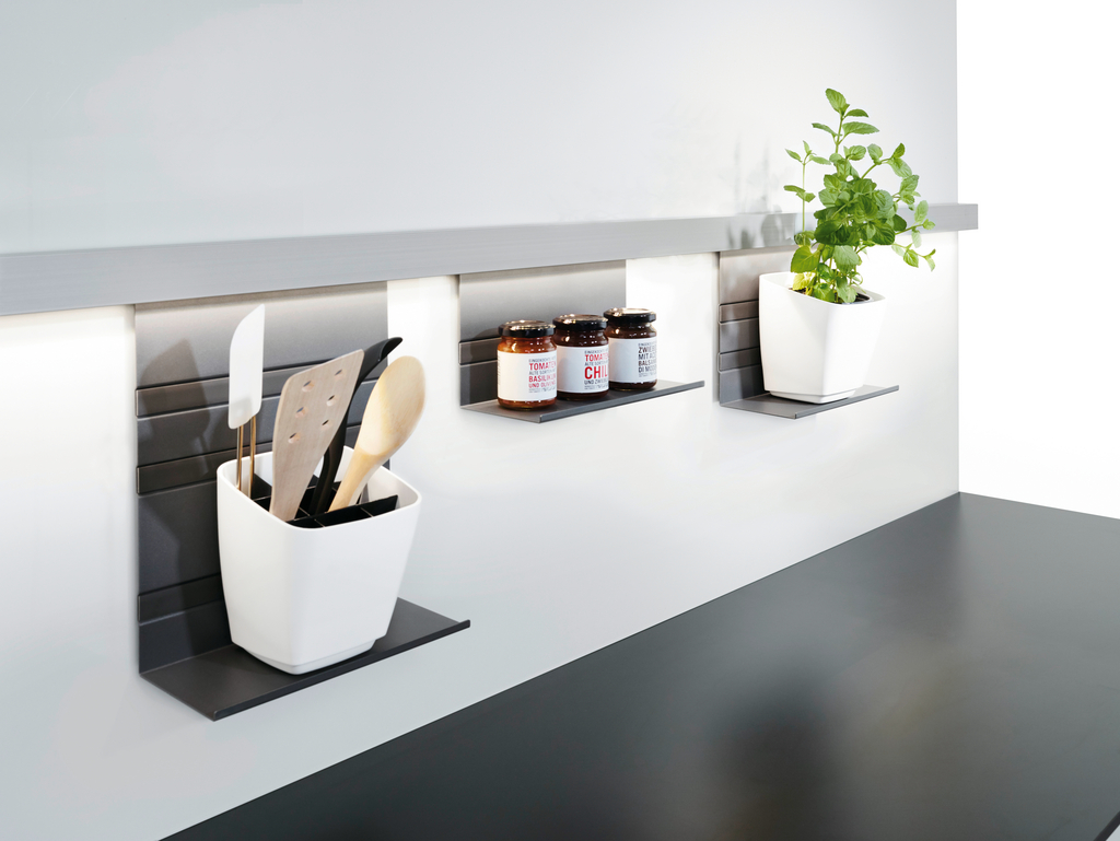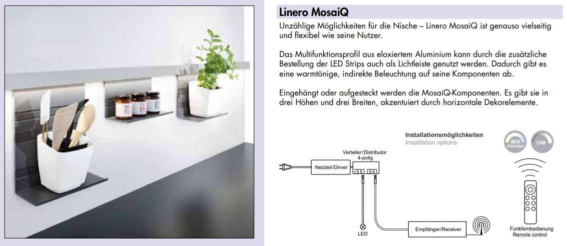 Flex Stripes. 12 Watt/m, 12 V DC stufenlose Regelung der Lichtfarbe von 2700 K warmweiß bis 6500 K kaltweiß Dimmfunktion: Helligkeit in drei Stufen dimmbar max. 101 Lumen/Watt bei 6500 K kaltweiß Längen passend zu den Profilleisten 12,5 x 10,25 mm (H x B) Linero MosaiQ Unzählige Möglichkeiten für die Nische Linero MosaiQ ist genauso vielseitig und flexibel wie seine Nutzer. Das Multifunktionsprofil aus eloxiertem Aluminium kann durch die zusätzliche Bestellung der LED Strips auch als Lichtleiste genutzt werden. Dadurch gibt es eine warmtönige, indirekte Beleuchtung auf seine Komponenten ab. Eingehängt oder aufgesteckt werden die MosaiQ-Komponenten. Es gibt sie in drei Höhen und drei Breiten, akzentuiert durch horizontale Dekorelemente.