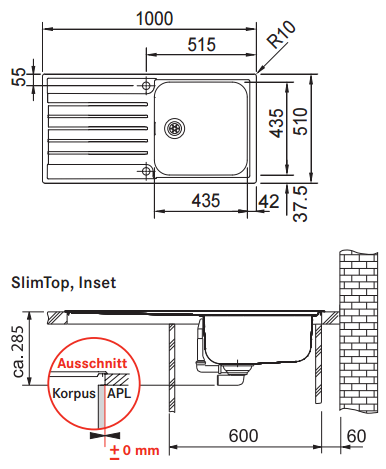 - Spülenmaß: 1000x510mm