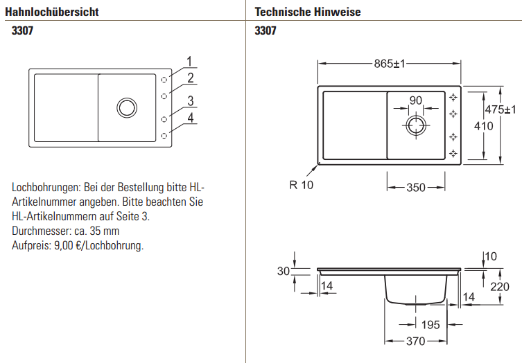 - Lochbohrung: bitte separat unter Zubehör bestellen.