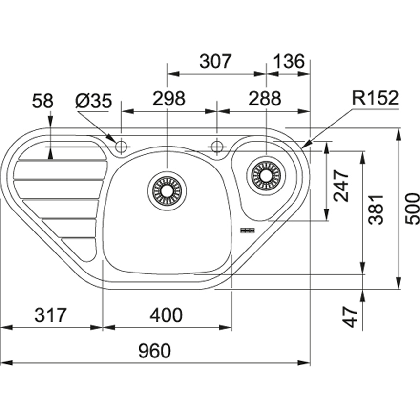 - Spülenmaß: 960 x 500 mm