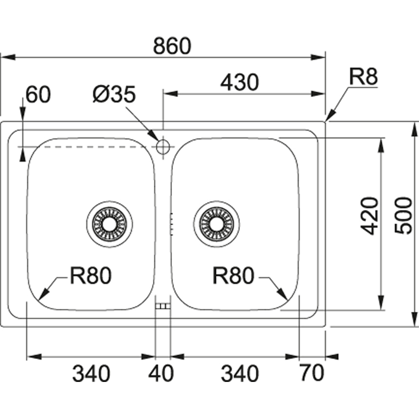 - Spülenmaß: 860x500 mm