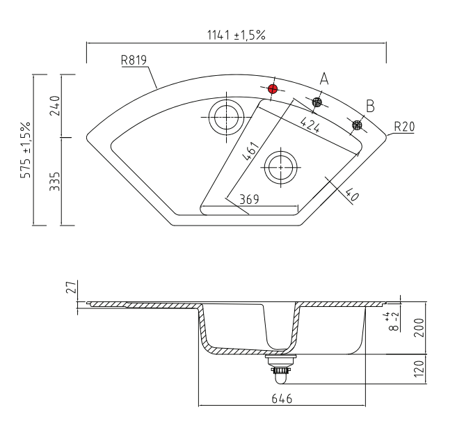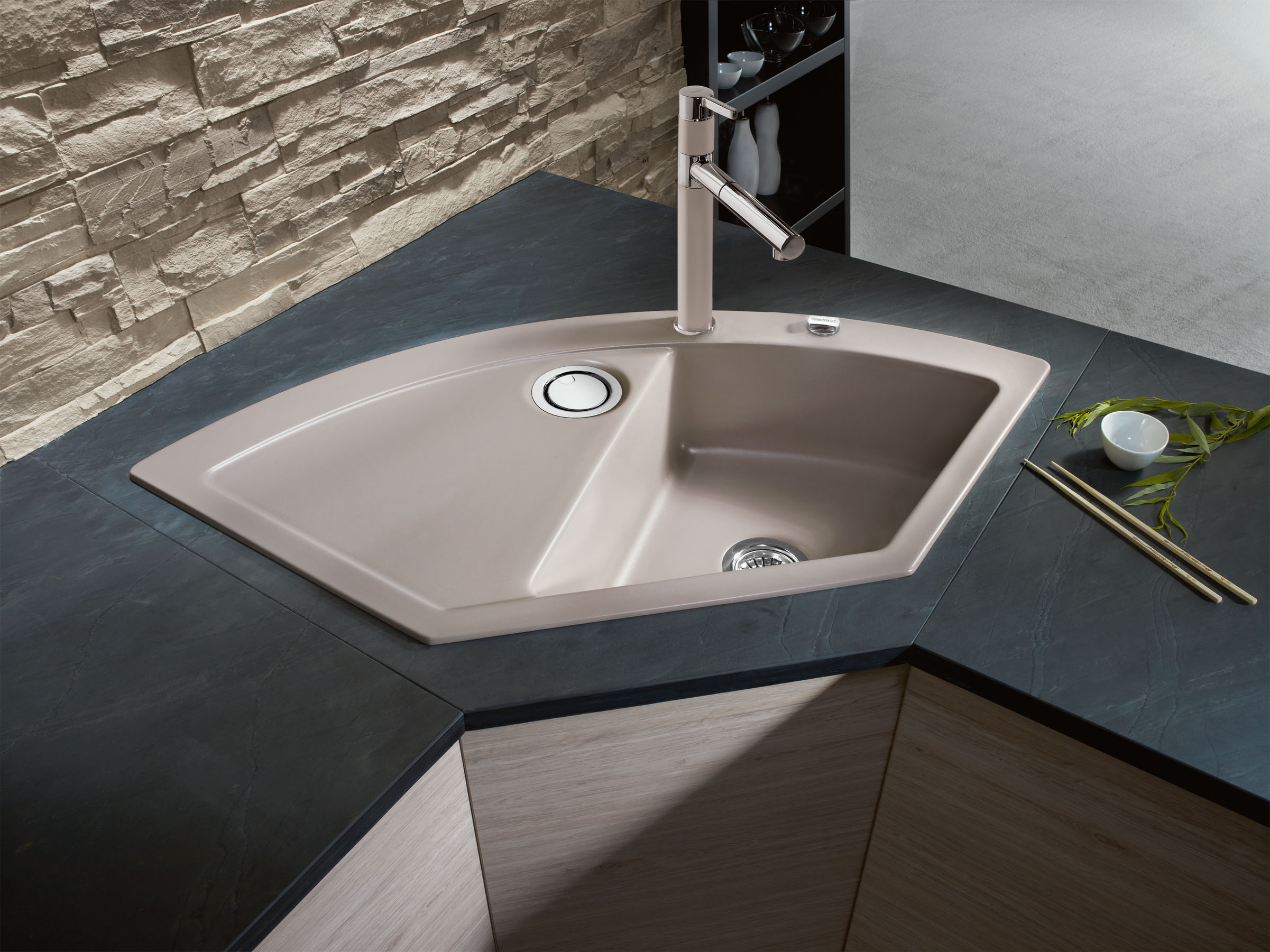- incl. Ablaufgarnitur mit Handbetätigung und Sinktop Resteausgruß-Abdeckung