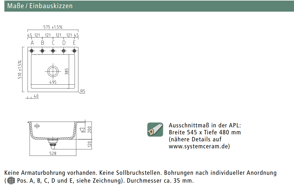 Ausschnittmaß in der APL: Breite 545 x Tiefe 480 mm