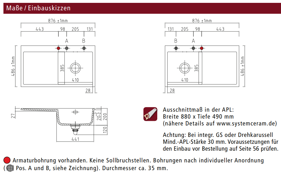 Ausschnittmaß in der APL: Breite 880 x Tiefe 490 mm