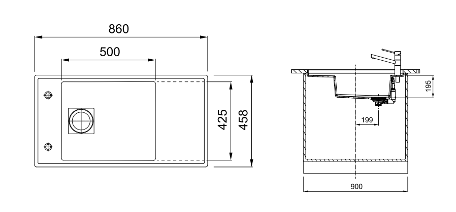 - Bei Einbau als Unterbauspüle, wird ein Unterschrank von 90cm benötigt.