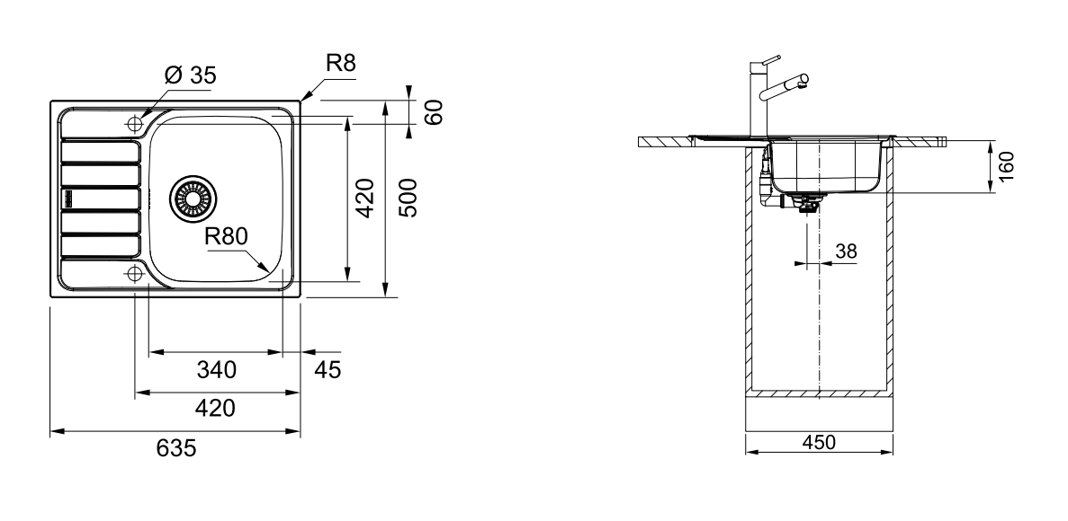 - Stilvolle Abtropfzone mit elegant laufenden Entwässerungsrillen