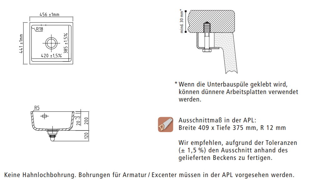 Achtung: Keine Hahnlochbohrung vorhanden. Bohrungen für Armatur / Excenter müssen in der APL vorgesehen werden.