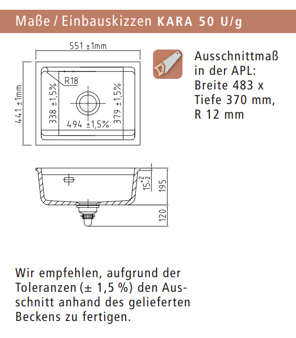 - Ausschnittmaß in der Arbeitsplatte: Breite 483 x Tiefe 370 mm, R 12 mm
