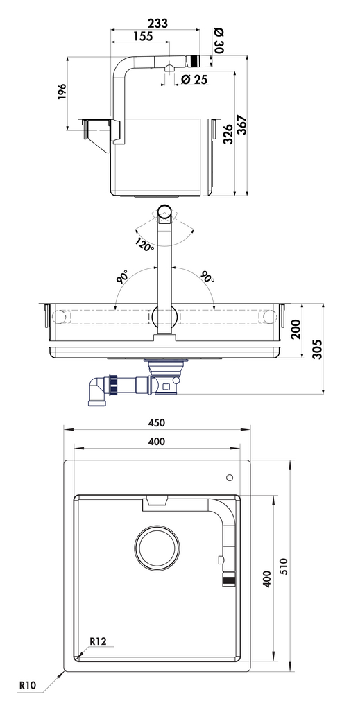 Auslauf 180° schwenkbar, Laminarstrahlregler 120° drehbar.