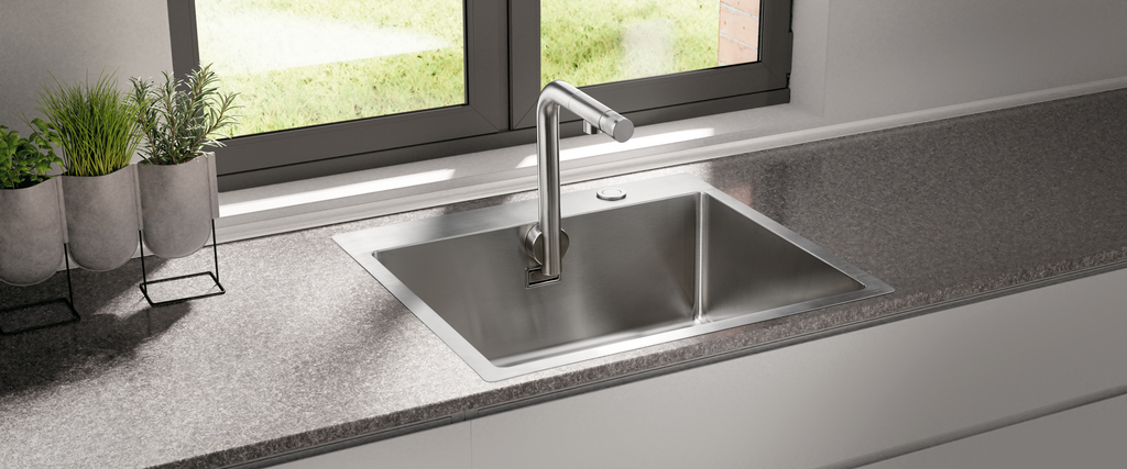 Mit fest integrierter Armatur rückt eine Spülen-Innovation in das Zentrum urban gestylter Küchen. Minimalistische Einzelbecken-Ästhetik und hoher Nutzungskomfort der stufenlos um 180° schwenkbaren Armatur stehen für die Perfektion einer einzigartigen Edelstahl-Kombination. Intuitiv und mit einem Griff beidseitig im Becken versenkbar, macht die elegante Armatur den Weg frei für den perfekten Vorfenstereinbau auf Arbeitsplattenebene. Der drehbare Auslauf ermöglicht in jeder Position senkrechten Wassereinlauf. Zusätzlich wertvolle Arbeitsfläche entsteht durch die zweiteilige optional erhältliche, die gesamte Spüle überbrückende Abdeckung. Viel Freiraum für alle Vorbereitungsarbeiten und die Nutzung der Armatur bleibt bei mittiger Position durch einen Ausschnitt gewährleistet. Edelstahlqualität in 1 Millimeter Materialstärke sichert Hochwertigkeit und Formbeständigkeit bei aufliegendem und flächenbündigen Einbau. Spüle und Armatur mit Schneidebrett verdeckt bilden eine freie Arbeitsfläche, besonders praktisch in kleinen Küchen.