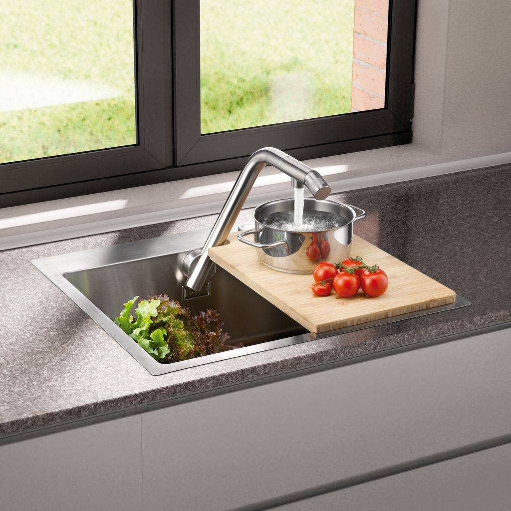 Mit fest integrierter Armatur rückt eine Spülen-Innovation in das Zentrum urban gestylter Küchen. Minimalistische Einzelbecken-Ästhetik und hoher Nutzungskomfort der stufenlos um 180° schwenkbaren Armatur stehen für die Perfektion einer einzigartigen Edelstahl-Kombination. Intuitiv und mit einem Griff beidseitig im Becken versenkbar, macht die elegante Armatur den Weg frei für den perfekten Vorfenstereinbau auf Arbeitsplattenebene. Der drehbare Auslauf ermöglicht in jeder Position senkrechten Wassereinlauf. Zusätzlich wertvolle Arbeitsfläche entsteht durch die zweiteilige optional erhältliche, die gesamte Spüle überbrückende Abdeckung. Viel Freiraum für alle Vorbereitungsarbeiten und die Nutzung der Armatur bleibt bei mittiger Position durch einen Ausschnitt gewährleistet. Edelstahlqualität in 1 Millimeter Materialstärke sichert Hochwertigkeit und Formbeständigkeit bei aufliegendem und flächenbündigen Einbau. Spüle und Armatur mit Schneidebrett verdeckt bilden eine freie Arbeitsfläche, besonders praktisch in kleinen Küchen.