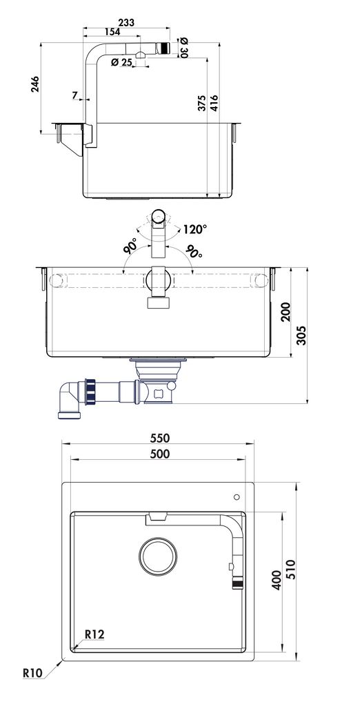 Einbauspüle. 3½" Korbventil mit Druckknopfexzentergarnitur.