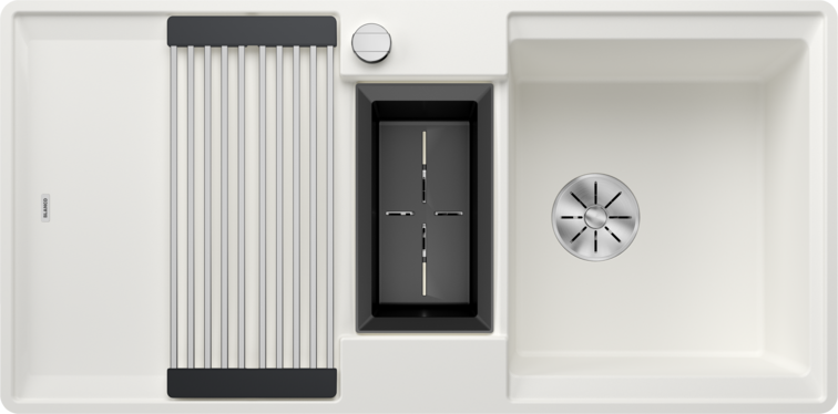 - Der mitgelieferte Eimer für die Resteschale passt in das zweite Becken und eignet sich hervorragend für Vorbereitungsarbeiten mit Wasser. Er kann auch in FLEXON II und SELECT II Eimern im Unterschrank aufbewahrt werden.