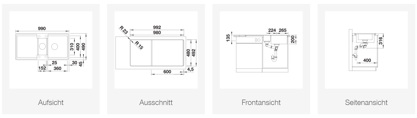 unterbündiger oder flächenbündiger Einbau ab 60 cm Unterschrank