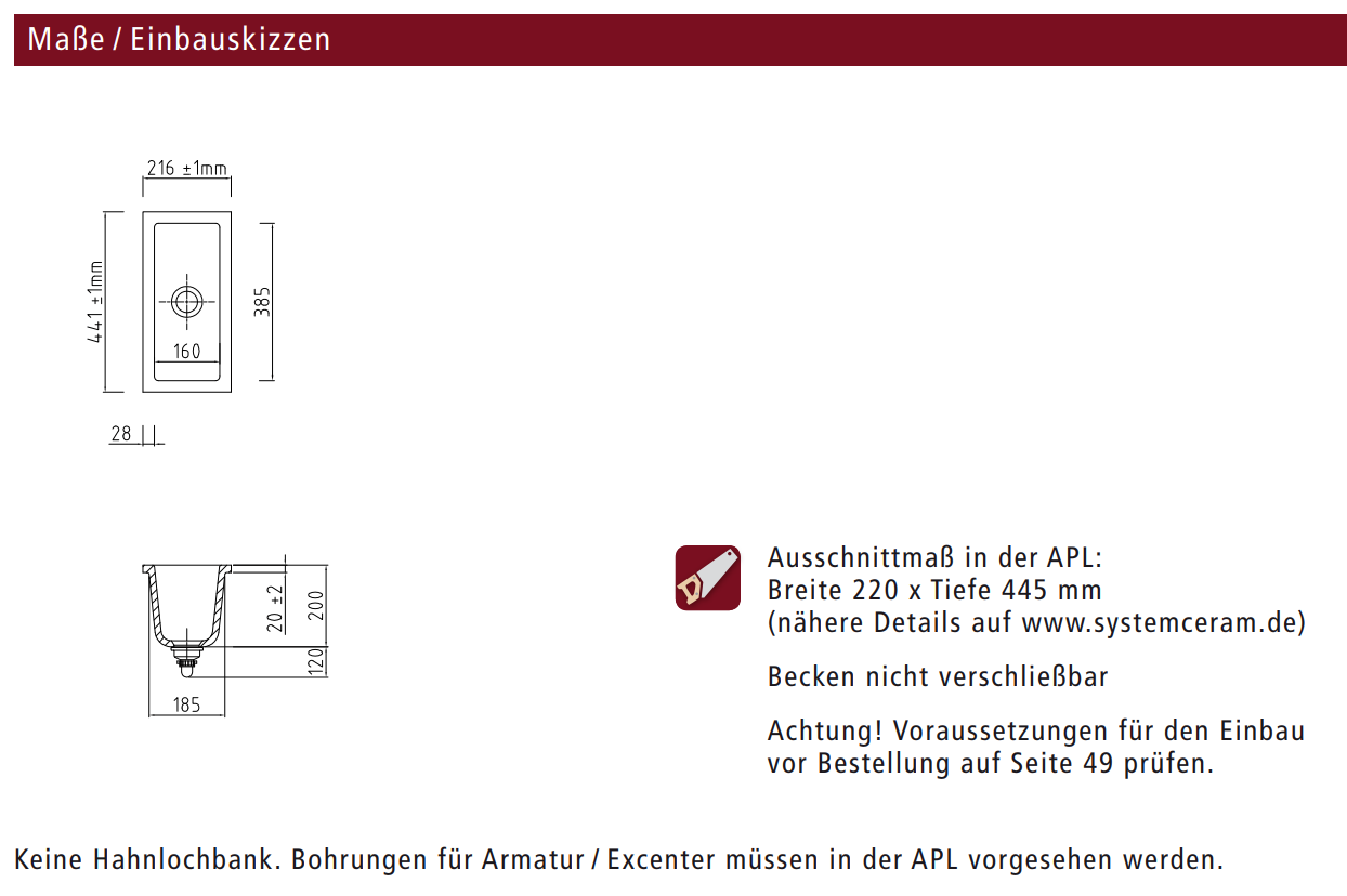 - Keine Hahnlochbank. Bohrungen für Armatur / Excenter müssen in der APL vorgesehen werden