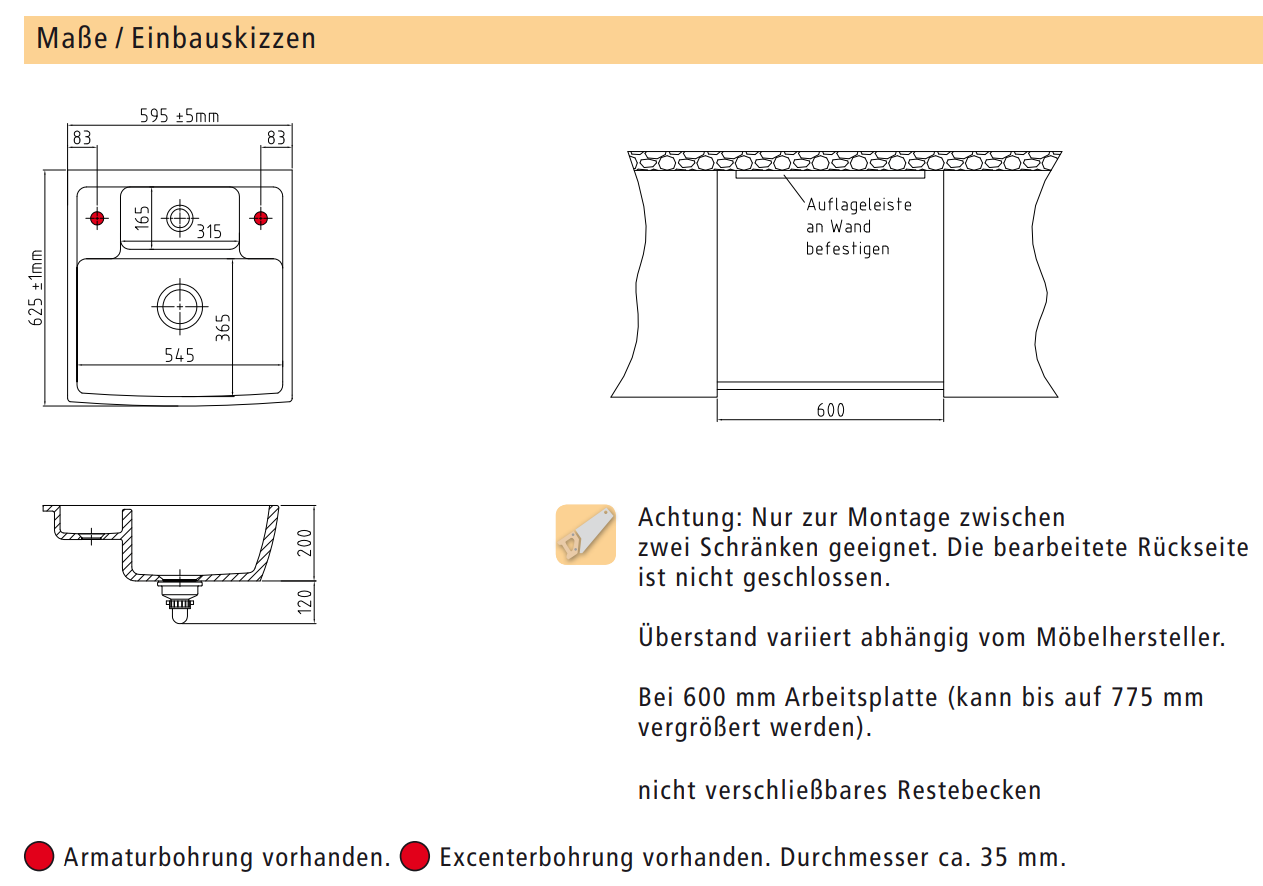 • Überstand variiert abhängig vom Möbelhersteller