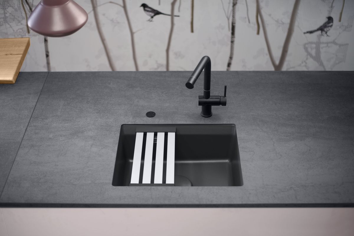 Auf den ersten Blick wirkt die Kara 50 U wie eine ganz gewöhnliche Unterbauspüle. Als Unterbau-Version der Kara 57 zeichnet sie sich jedoch besonders durch die beiden leicht angeschrägten Ränder aus. Hier findet bei Bedarf die im Lieferumfang enthaltene MEDIO MATTE Halt, die als optionales Abtropfgitter oder variable Arbeitsfläche genutzt werden kann. Erhältlich in 15 verschiedenen Farben passt sich die Kara 50 U somit jedem Küchenstil und jeder Arbeitsplatte perfekt an.