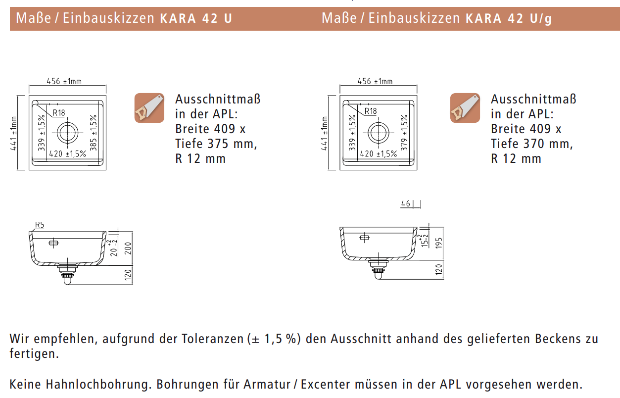 inkl. Ablaufgarnitur mit Excenterbetätigung und Drehgriff Edelstahl glänzend rund Ø 45 mm - Keine Hahnlochbohrung. Bohrungen für Armatur / Excenter müssen in der APL vorgesehen werden.