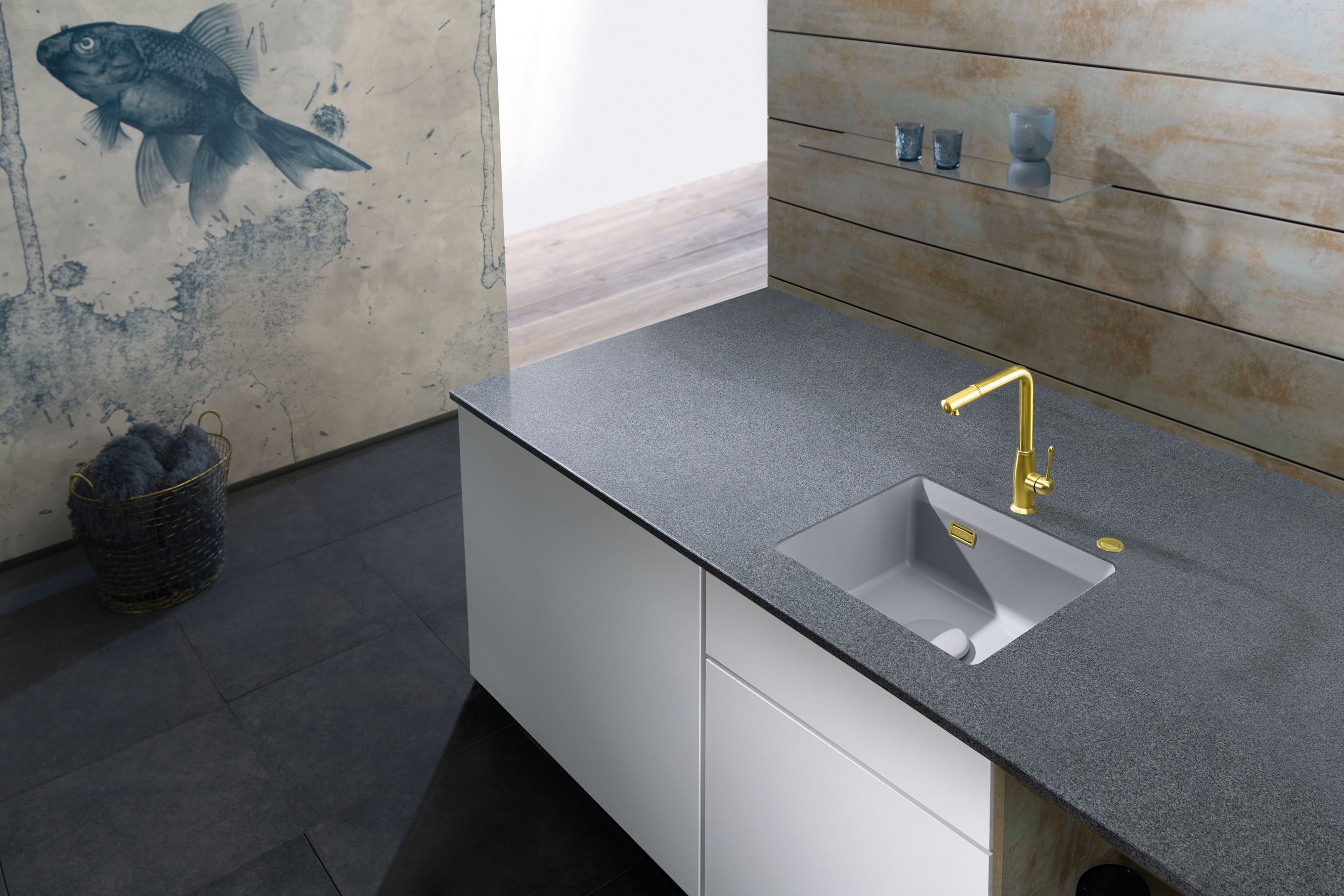 Die stylische Unterbauspüle KARA 42ug überzeugt mit puristischer Eleganz und fügt sich ästhetisch in die hochwertige Arbeitsfläche ein. Die Anbringung des Spülbeckens an der Unterseite der Arbeitsplatte sorgt für ein ordentliches und minimalistisches Erscheinungsbild. Zudem lassen sich so Dreck und Krümel von der Arbeitsfläche ganz einfach ins Spülbecken kehren. Des Weiteren ist die große Einbeckenspüle mit metallischem Sink Cover, Überlauf und Premium-Drehexcenter ausgestattet und in 16 modernen Naturtönen erhältlich. Dadurch bietet Sie Ihnen die perfekte Kombination aus Funktionalität und Stil.