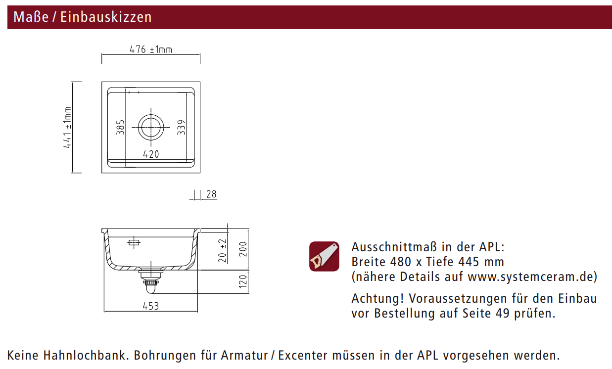 oder inkl. Ablaufgarnitur mit Excenterbetätigung und Drehgriff Edelstahl glänzend rund Ø 45 mm und Medio-Matte Alu - Ausschnittmaß in der APL: Breite 480 x Tiefe 445 mm