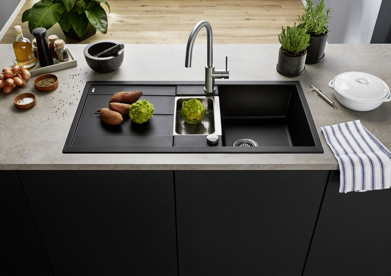 Zusatzbecken mit Edelstahlschale sorgt für hohen Komfort beim Arbeiten