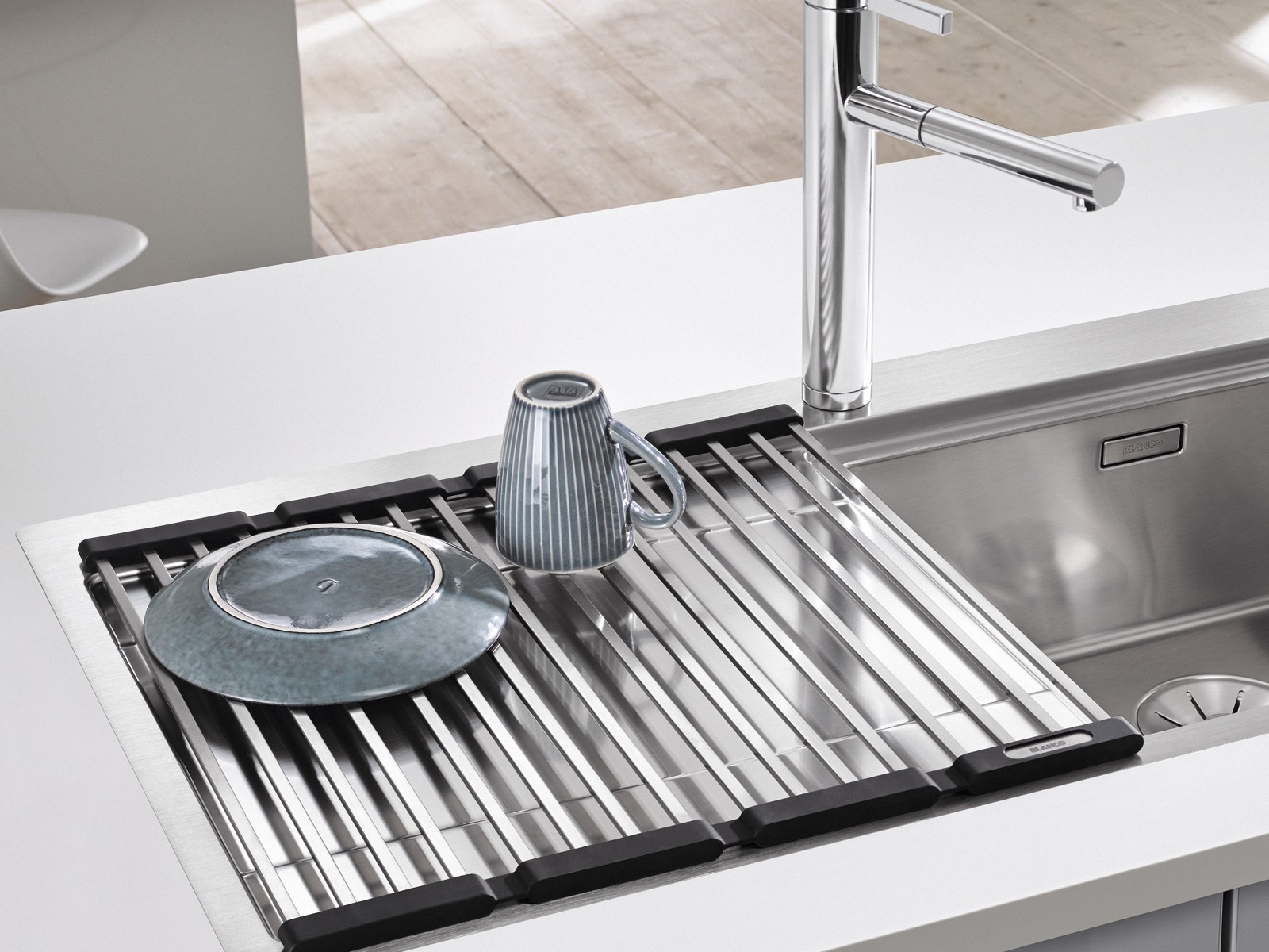 Gerade bei empfindlichen Oberflächen dient sie als Kratz- und Hitzeschutz und ist groß genug, um beispielsweise eine ofenheiße Auflaufform darauf abzustellen. Direkt auf dem Beckenrand aufgelegt, können kraftsparend Töpfe mit Wasser befüllt werden. Auch für rillenfreie Abtropfflächen ist die Klappmatte ein nützliches Extra, da Gefäße auf ihr besser abtropfen können. Unentbehrlich macht sich das raffinierte Zubehör an Einzel- und Doppelbecken ohne Tropfbereich.