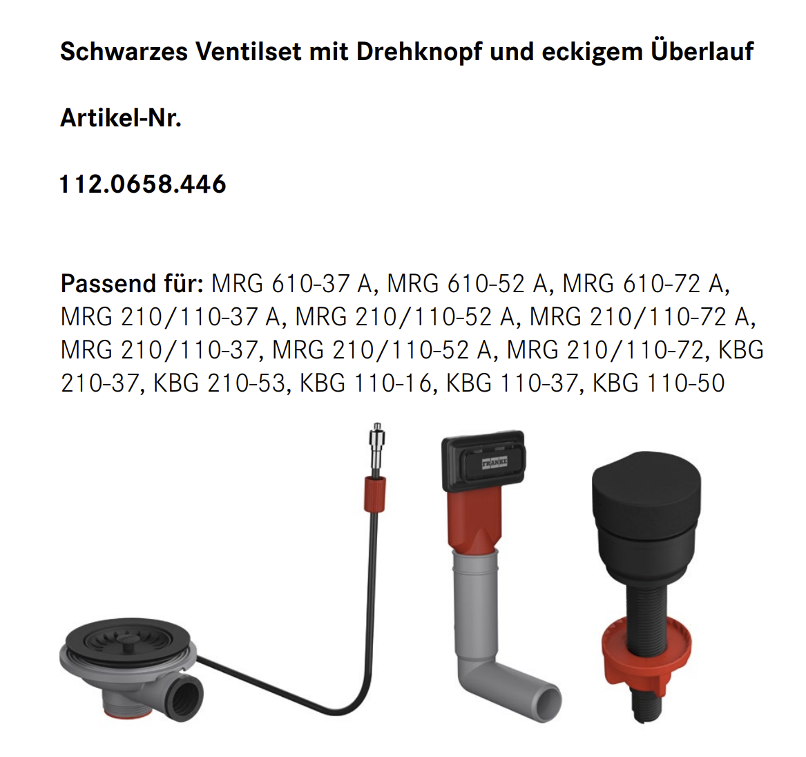 - Schwarzes Ventilset mit Drehknopf und eckigem Überlauf