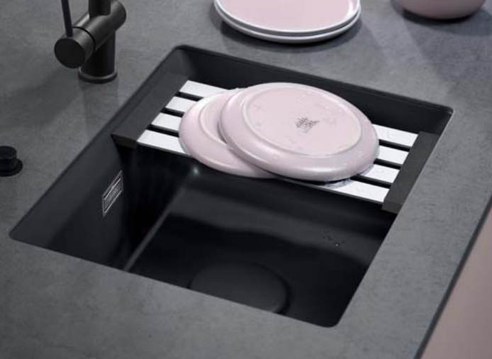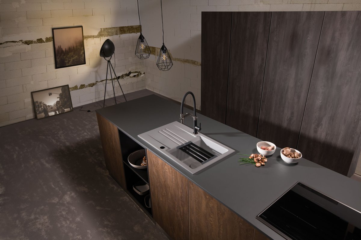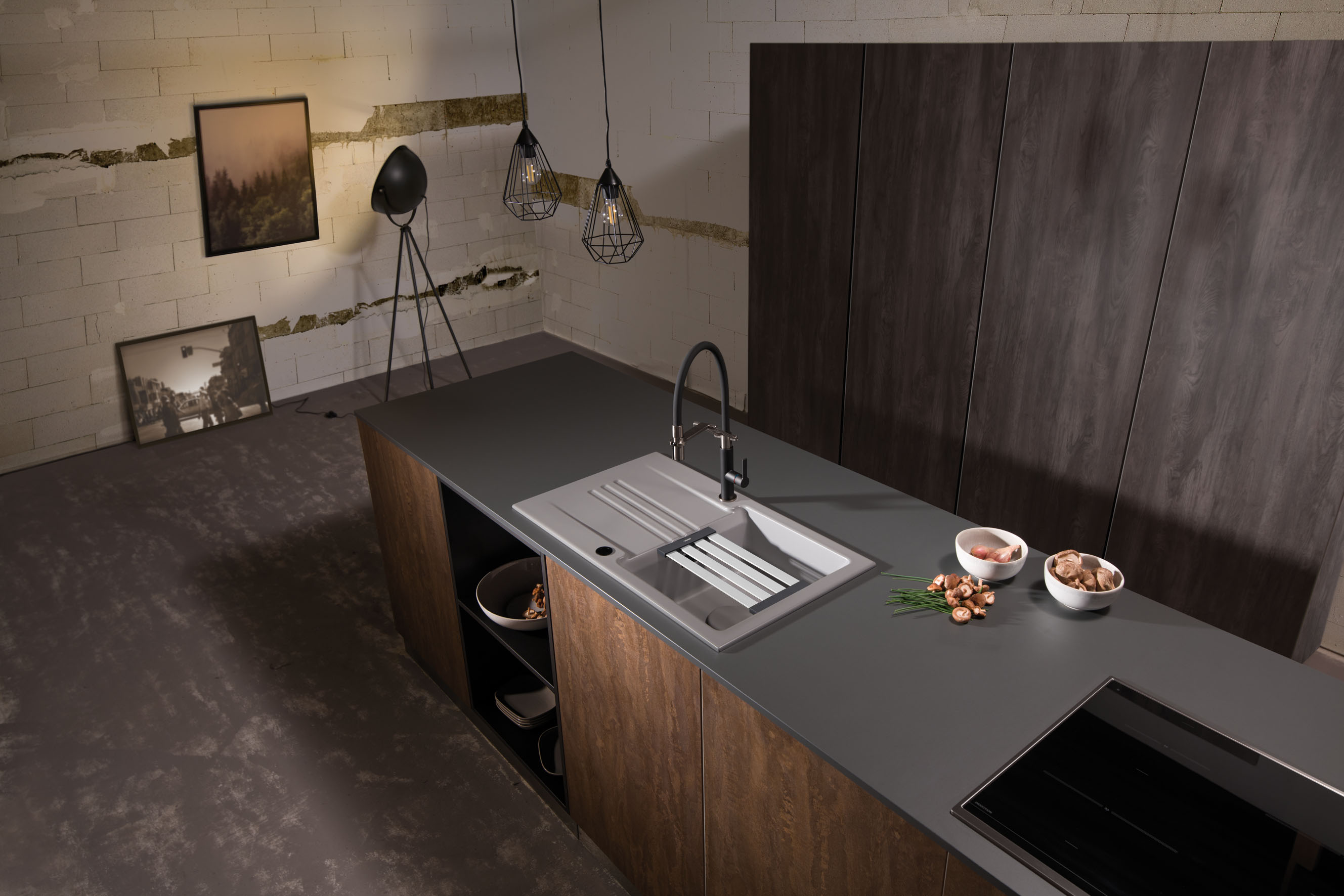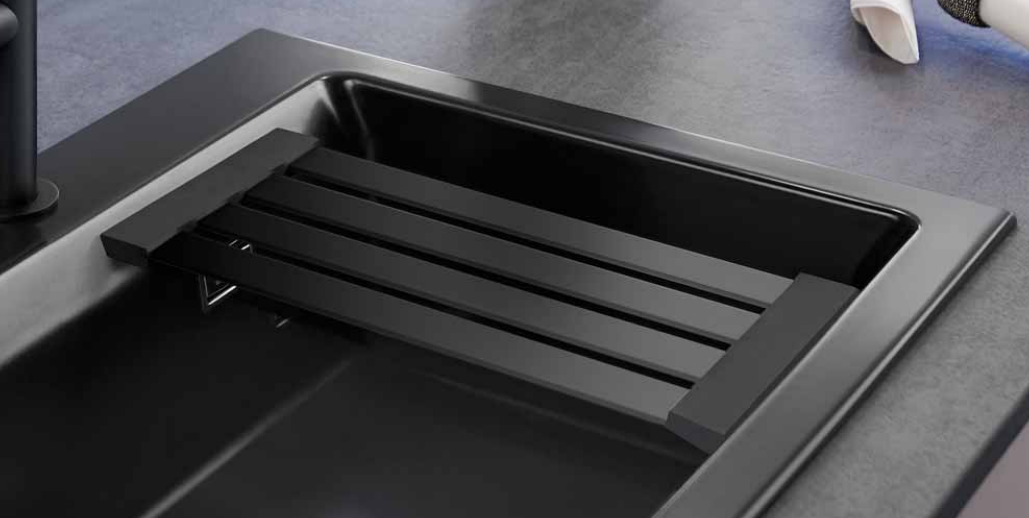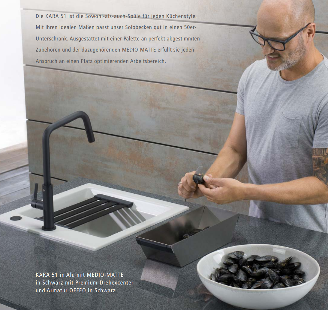 Die jeweils gegenüberliegenden Beckenkanten der Kara sind nach innen abgeschrägt. Mit dieser eleganten und cleveren Lösung, lässt sich eine zweite Funktionsebene einrichten. Exakt abgestimmt auf das Kantenmaß gibts ein passgenau einzusetzendes Board: die MEDIO-MATTE. In der KARA Familie gibt es Solobecken und Becken mit praktischem Abtropfteil. Wird die MEDIO-MATTE mittig platziert, entsteht eine optische Fortsetzung in den markanten Rillen der Abtropf- und Zubereitungsfläche.