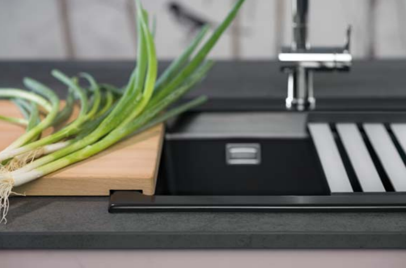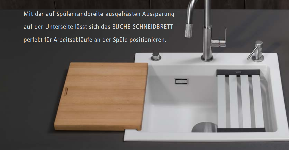 - Mit der auf Spülenrandbreite ausgefrästen Aussparung auf der Unterseite lässt sich das Buche-Schneidbrett perfekt für Arbeitsabläufe an der Spüle positionieren