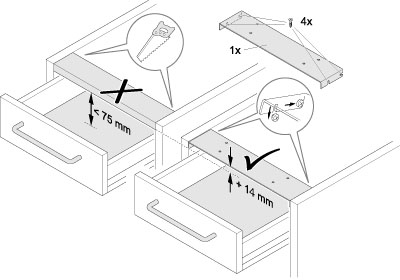 - Diese werden benötigt, wenn die lichte Einbauhöhe zur Montage nicht ausreicht, z.B. bei Unterflurführungen oder teilweise bei grifflosen Küchen.